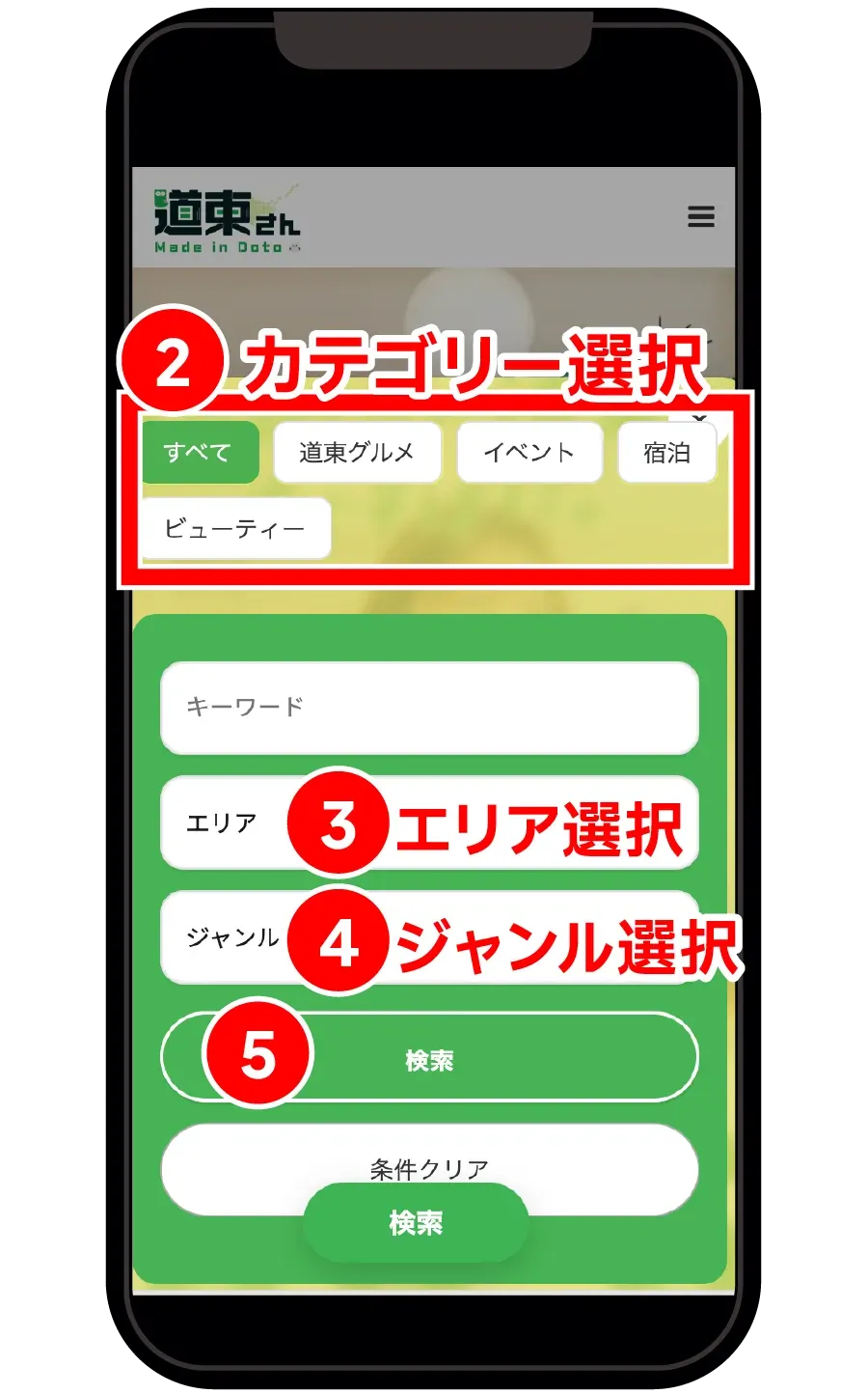 ②〜⑤ カテゴリー・エリア・ジャンルを選択して「検索」。カテゴリー「すべて」のまま「検索」で全件表示されます。
