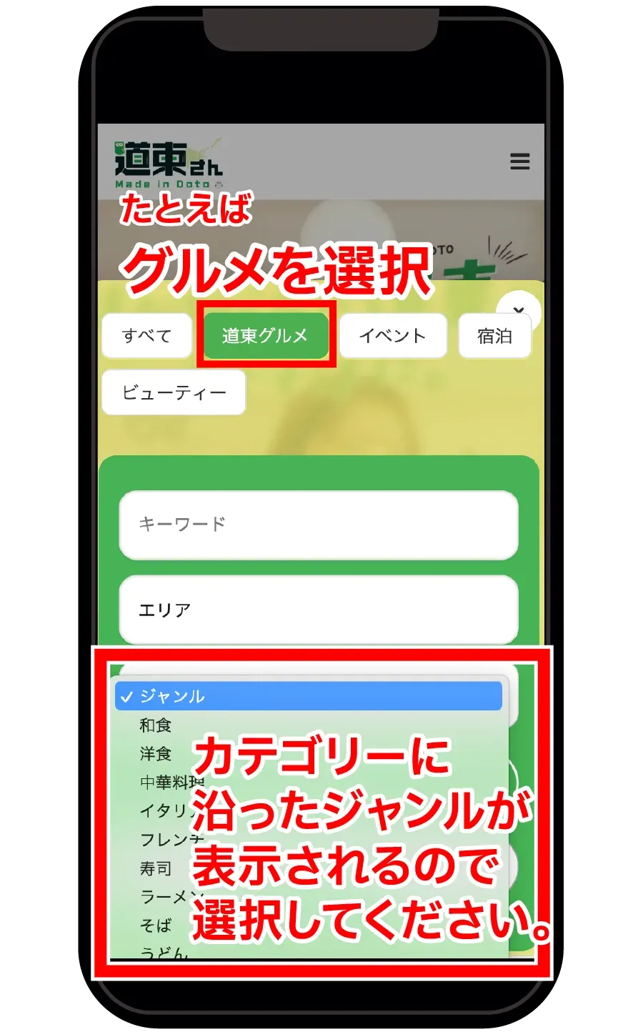 例)カテゴリー「道東グルメ」を選択すると、グルメジャンルが表示されます。