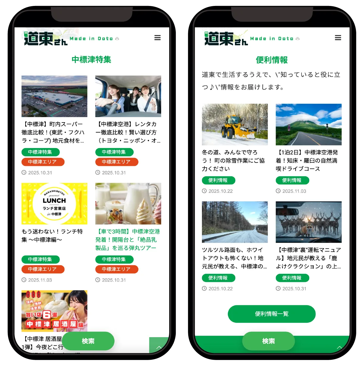 「道東さん」では、検索以外にもあらかじめ道東のオススメ情報をまとめたコンテンツや、道東で生活するうえでのお役立ち便利情報なども掲載しています。