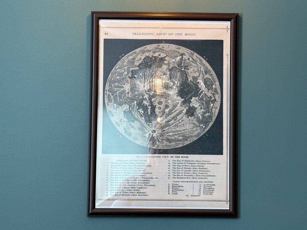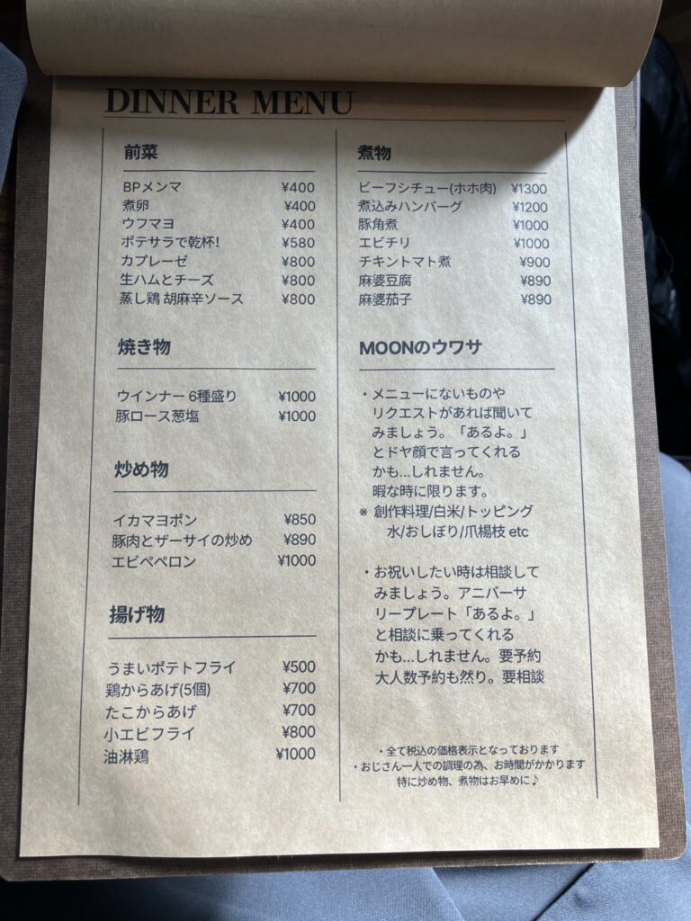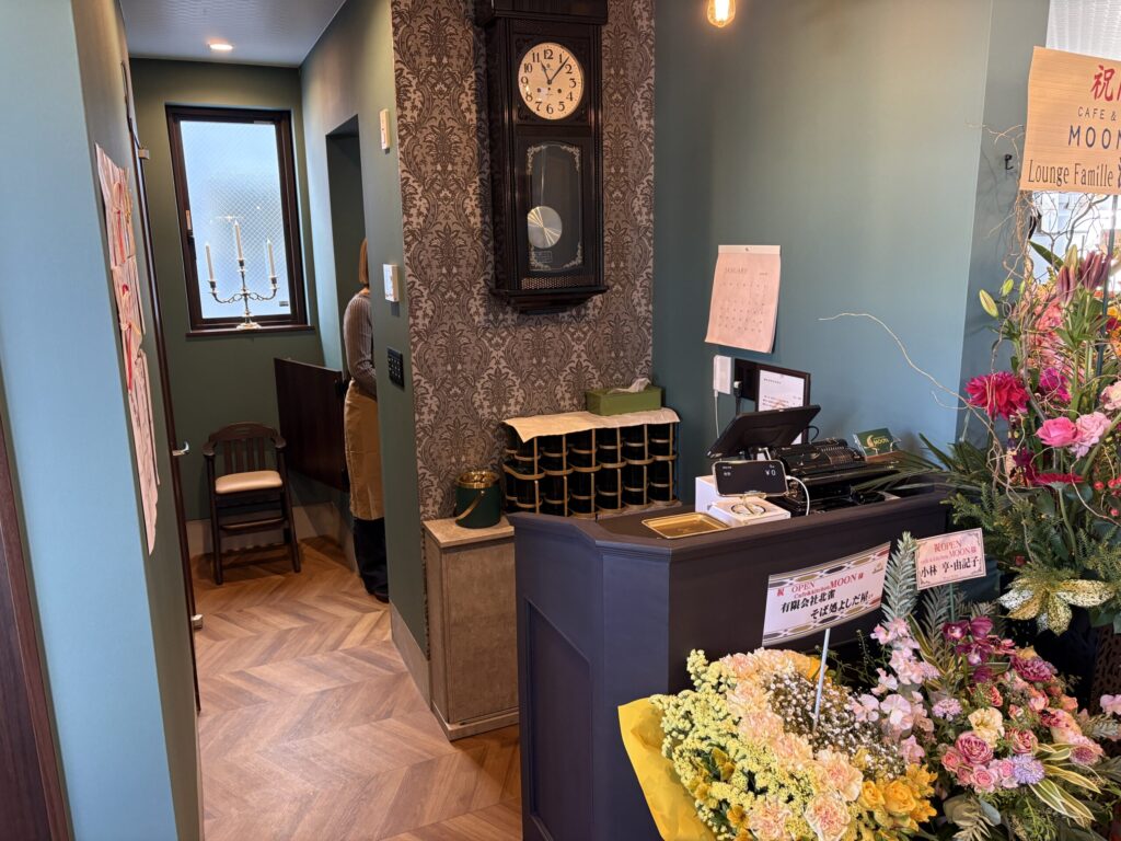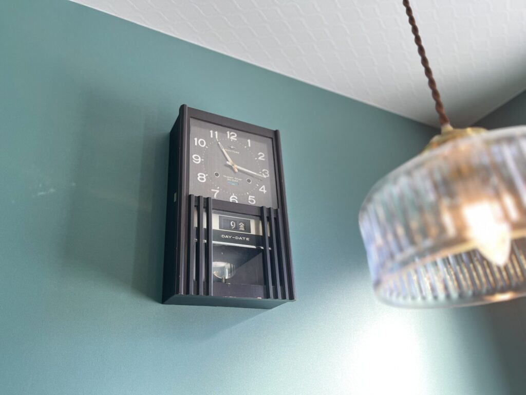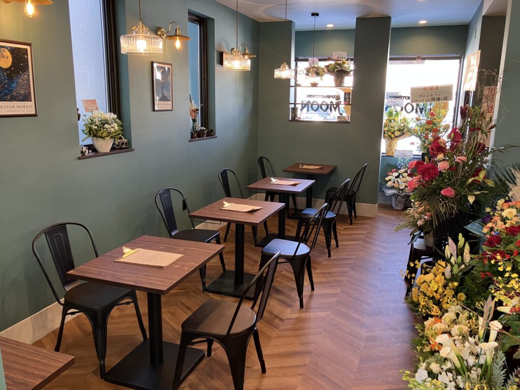 お店に入ると、シンボルである「月」のディスプレイと、落ち着いたグリーンの壁が迎えてくれます。 店内には、タイガー計算機やヴィンテージのラジオなど、オーナーこだわりのアンティーク雑貨がずらり。まるで「お父さんの書斎」に招かれたような、どこか懐かしく温かい空間は、料理を待つ時間さえもワクワクさせてくれます。