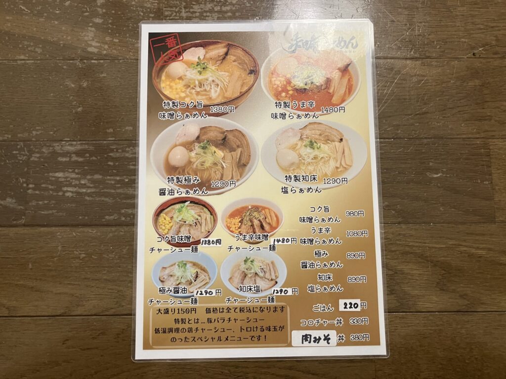 「知床らーめん なかがわ」のメニューは、味噌・醤油・塩といった定番の味に加え、他ではなかなか見かけない「煮干し系のつけ麺」や「まぜそば」も楽しめます。麺の太さやスープの味付けなど、メニューごとに異なるこだわりが感じられ、どのラーメンを食べるか迷ってしまうほどです。