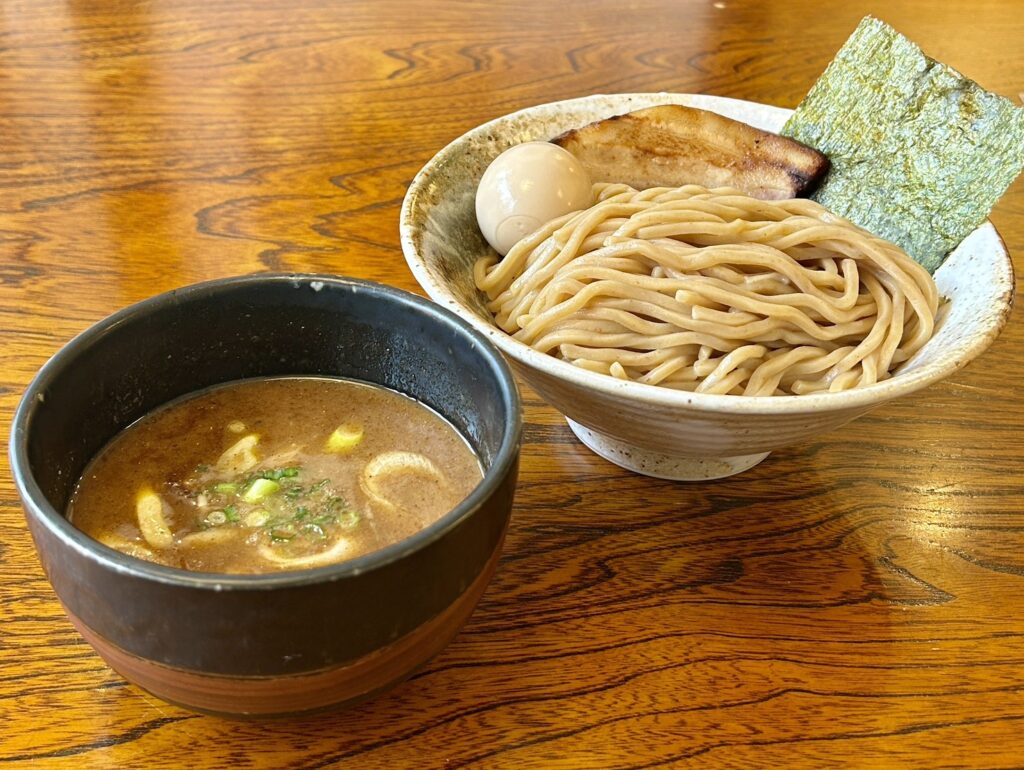 煮干し好きにはたまらない、そして煮干しが苦手な人にこそ試してほしいのが「濃厚煮干しつけ麺」です。魚介の旨みを凝縮しながらも、煮干し特有のえぐみや臭みを丁寧に取り除き、洗練された味わいに仕上げています。特徴的なのはうまみ、酸味、甘みのバランスが絶妙に計算されたつけダレ。このタレが、もちもちの麺によく絡み、箸が止まらなくなる美味しさを生み出します。これまで煮干し系を敬遠していた方も、きっとその魅力に開眼するはずです。