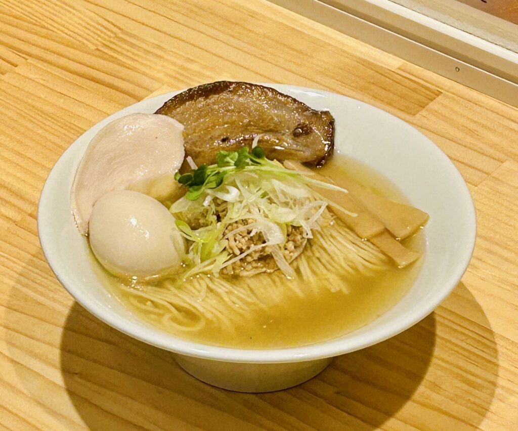 あっさりとしたラーメンがお好みの方には「特製知床塩らぁめん」がおすすめです。さっぱりしながらも、魚介の風味を感じる奥深いスープが特徴。このラーメンのために特別に作られた「知床鶏」の鶏チャーシューが添えられており、しっとりとした食感と鶏ならではの繊細な旨みが、塩スープの味わいを一層引き立てます。バランスの取れた上品な一杯です。
