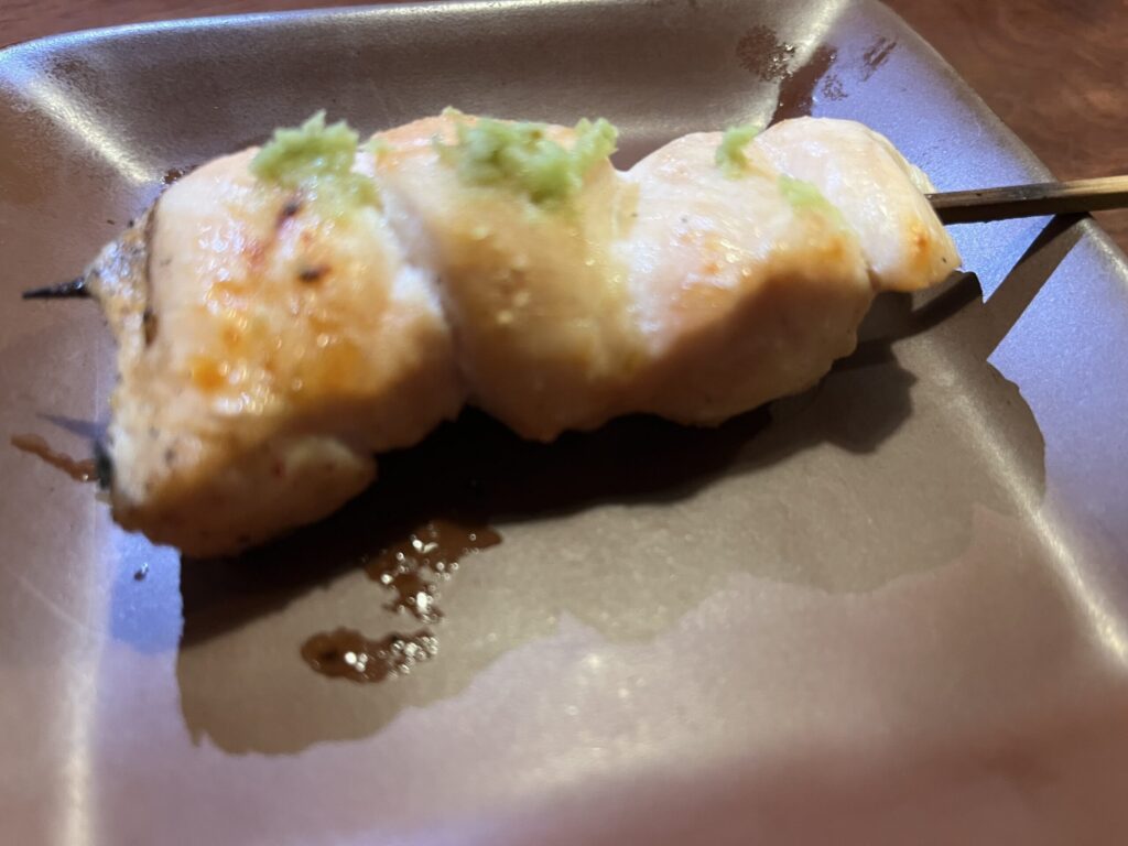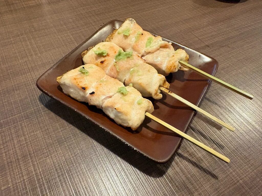• ささみのサビ焼き 絶妙な火入れによって、パサつくイメージを覆す、驚くほどしっとりとした食感に仕上げられたささみ。その上に乗せられた本わさびの爽やかな風味が、ささみの繊細な旨みを引き立てます。シンプルだからこそ、その美味しさが際立つ、大人向けの味わいです。