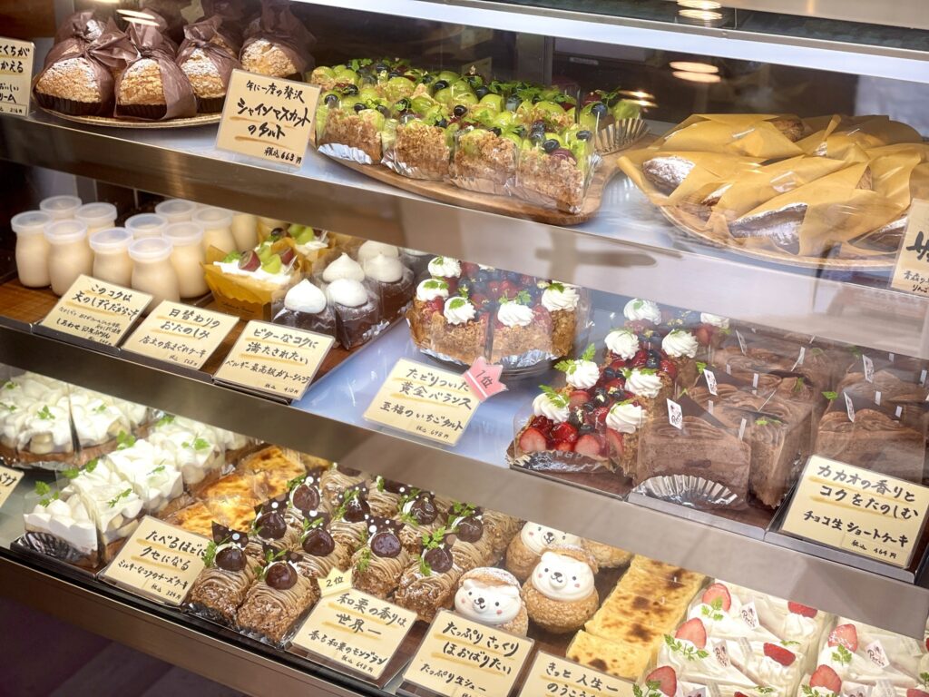 ショーケースにはキラキラしたケーキが並び、棚にはギフトにぴったりの焼き菓子が充実。友人や家族への手土産選びにも最適なお店です。