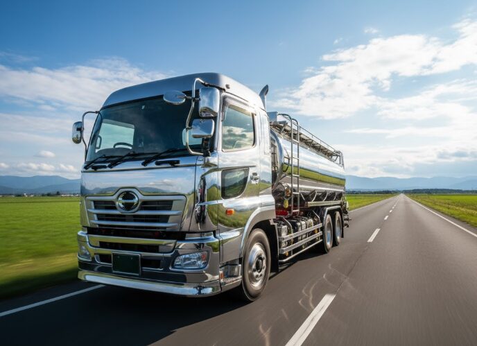 鏡のようにピカピカに磨かれた、巨大な銀色のタンクローリー。
