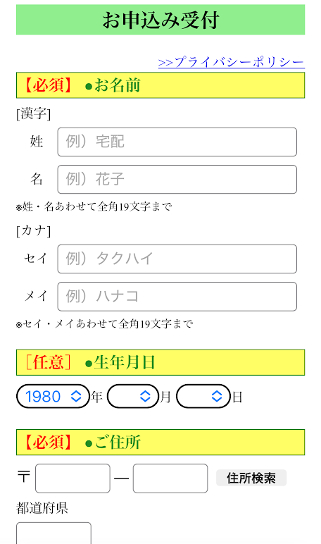 • お名前: 漢字とカタカナで入力します。