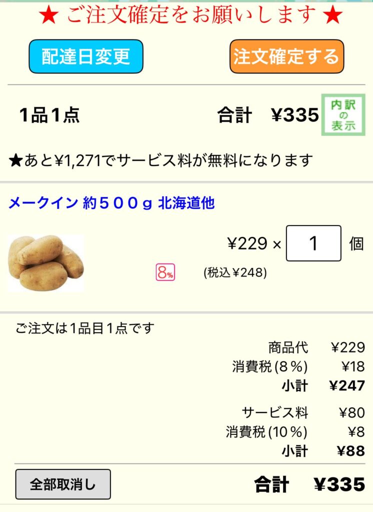 買い物が終わったら、画面右上などの「カゴ」ボタンを押して中身を確認します。