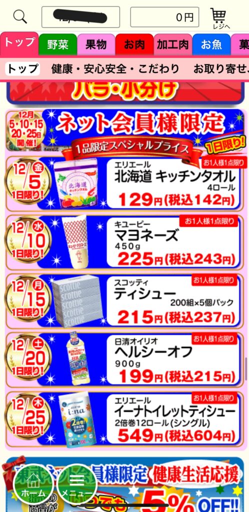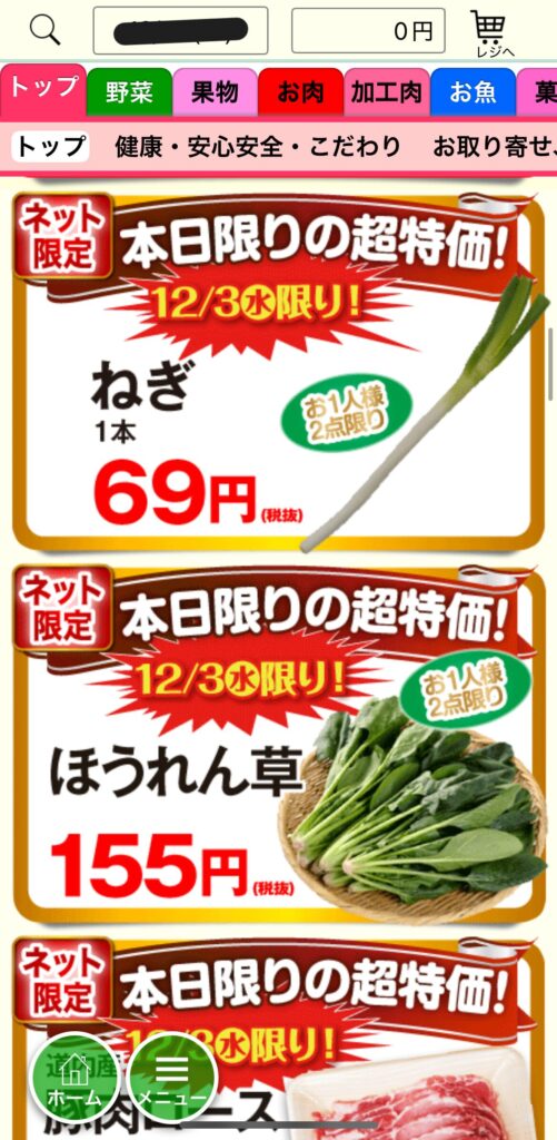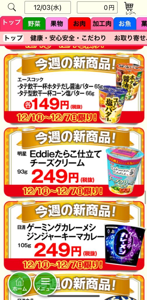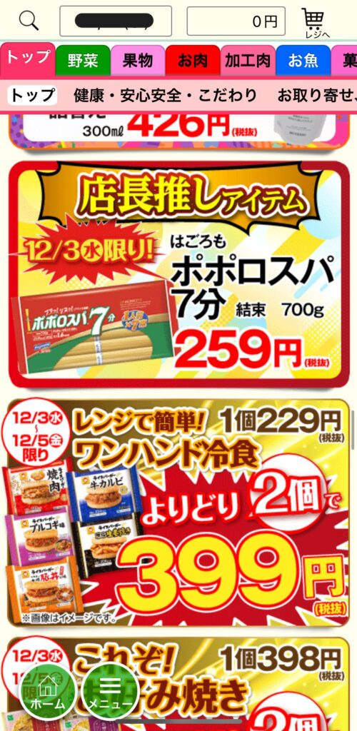 ★時短テクニック トップ画面には「本日のチラシ商品」が並んでいます。特売品が欲しい時は、ここから選ぶのが一番早いです。